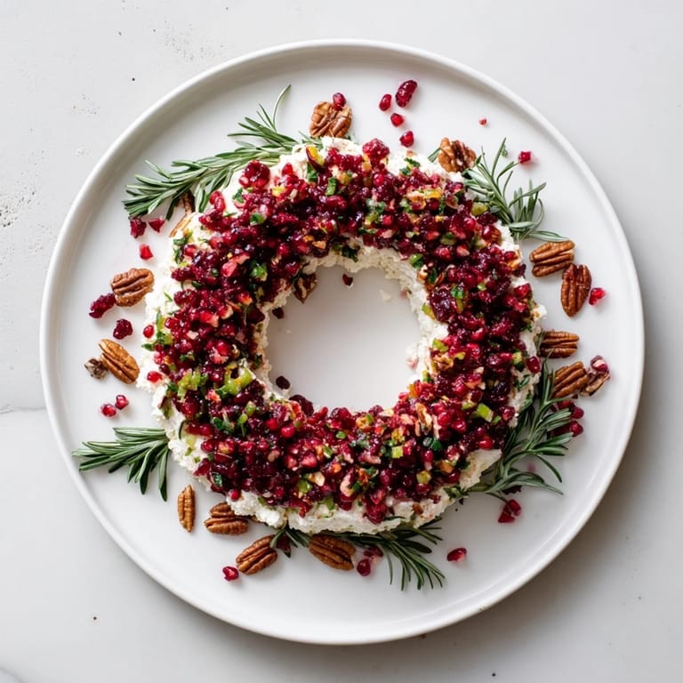 Save A festive and vibrant appetizer featuring tangy cranberries, creamy feta, and herbs, shaped into a beautiful holiday wreath perfect for entertaining.