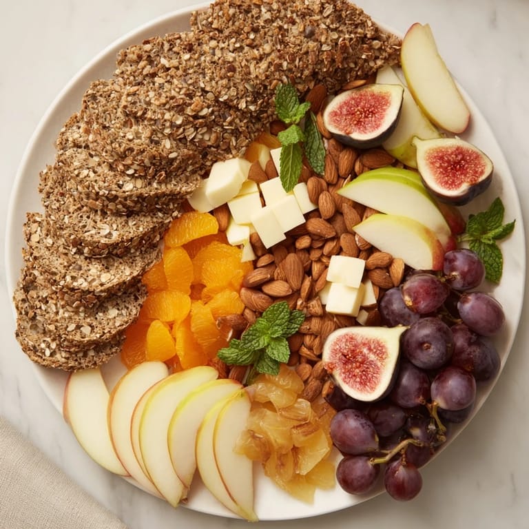 - Place apple slices and pear slices in overlapping fans, letting colors and textures weave between the breads and grains. Scatter grapes in clusters, tuck apricots and figs into gaps—think of it as planting, not placing.