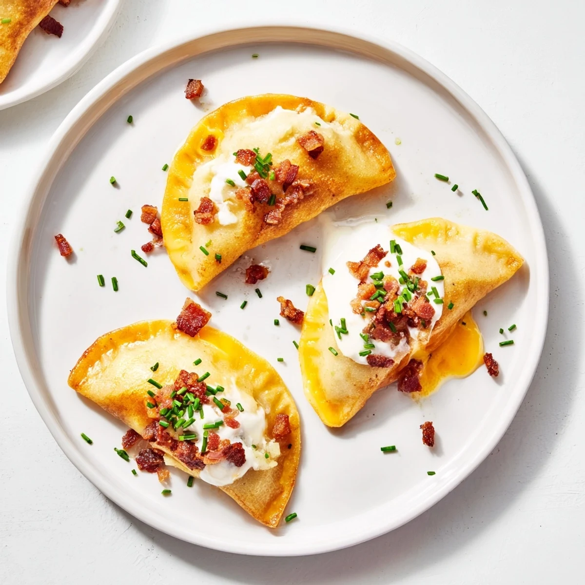 - Arrange dumplings on a platter. Garnish with extra sour cream, cheddar, chives, and bacon bits if desired.