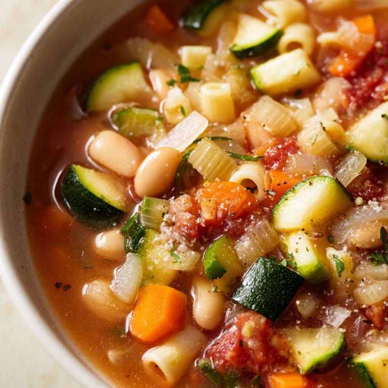Classic minestrone uses onion, carrots, celery, and zucchini, but you can add spinach, green beans, or potatoes for variety.