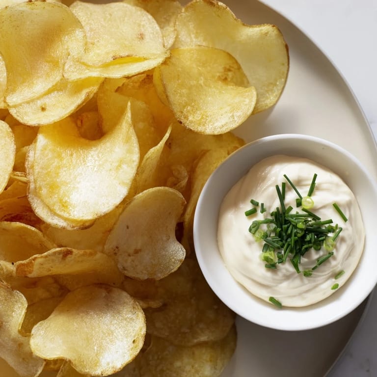 Save A crowd-pleasing snack featuring crisp salty potato chips paired with a creamy tangy onion dip—perfect for parties game nights or casual gatherings.