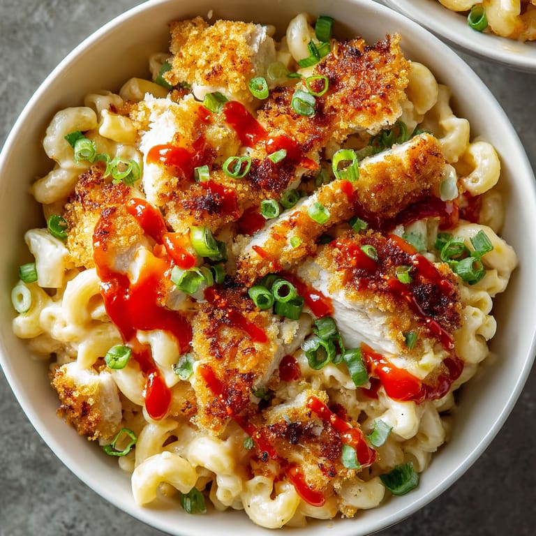 - Pour cheese sauce over the cooked macaroni and toss gently so every bit is coated Mound into shallow bowls or a large platter Arrange hot crispy chicken bites on top Drizzle with more sweet chili sauce and sprinkle sliced green onions for a final fresh pop This is the moment kids and adults gather around