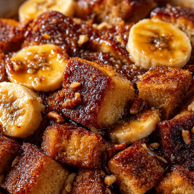 Save Warm bread pudding layered with caramelized bananas and drizzled with rich rum sauce transforms basic pantry staples into the ultimate comfort dessert. This Banana Foster Bread Pudding brings together tender cubes of bread that soak up a cinnamon custard, all finished with a buttery brown sugar topping that feels extra special, especially served warm.