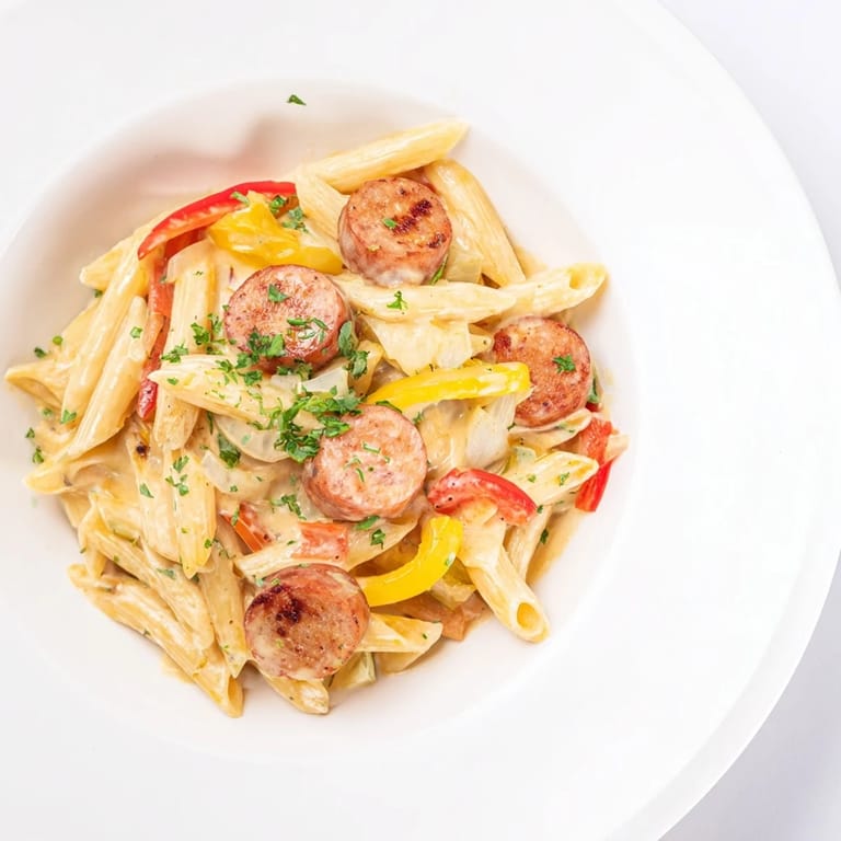 Smoked sausage sliced into thin rounds adds rich smoky flavor that pairs perfectly with the creamy sauce.
