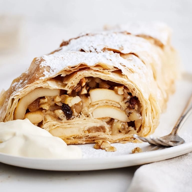 Save A timeless Austrian dessert featuring flaky pastry filled with spiced apples, raisins, and a touch of cinnamon. Perfect served warm with vanilla sauce or whipped cream.
