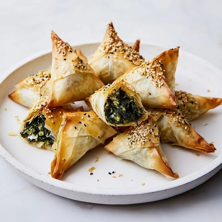 To get the perfect crispiness, be sure to brush each phyllo strip generously with melted butter before folding to prevent drying out. Keeping the phyllo covered with a damp towel while working prevents it from becoming brittle. For a quicker prep, thoroughly cook and cool the spinach to remove excess moisture, ensuring the filling is not watery.