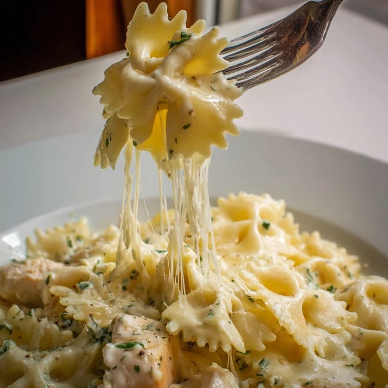 Save Tender chicken and bowtie pasta tossed in a rich garlic butter sauce, topped with melted mozzarella for a comforting and flavorful dish.