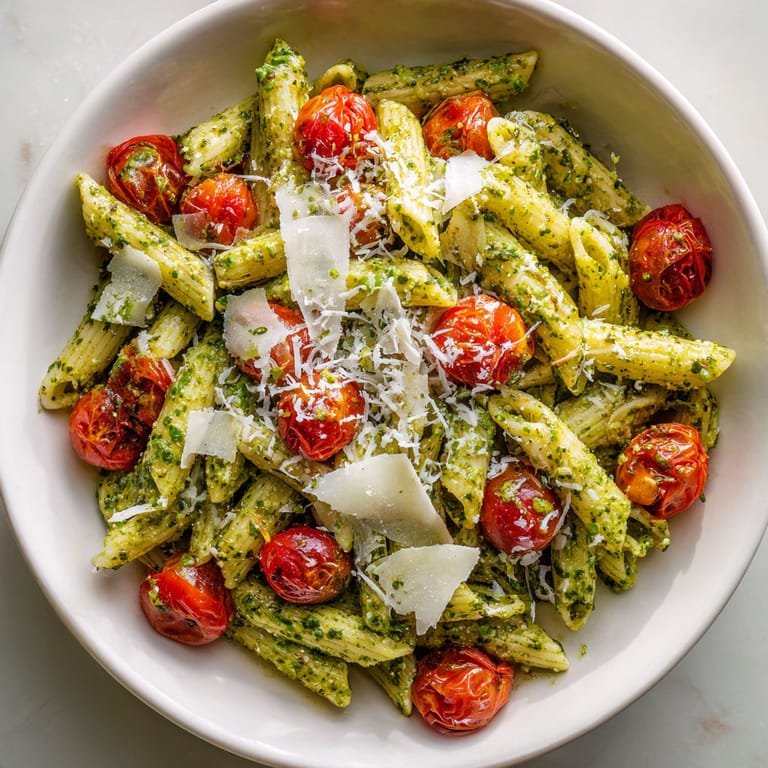 - Shave or grate generous amounts of Parmesan over the top The cheese melts into the pesto creating a silky finish Serve immediately while the pasta is still warm and glossy