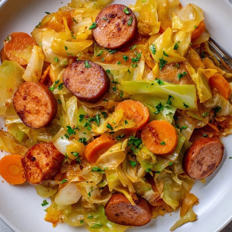 Save A rustic one-pan dish featuring smoky sausage tender cabbage and aromatic vegetables. Perfect for a comforting weeknight meal.