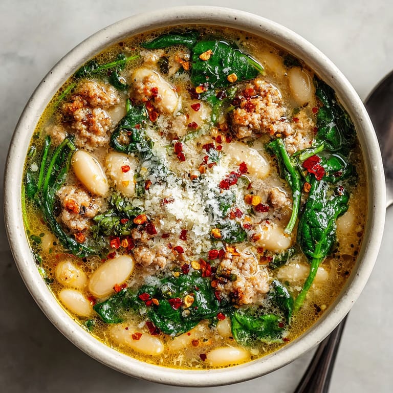 Save This cozy sausage and white bean soup is my go—to dish when I need something hearty, comforting, and quick for a chilly night. Spicy sausage and creamy beans simmered with fresh greens make a meal that feels both rustic and full of flavor. With pantry staples and a short preparation time, this soup is perfect for those evenings when you want something satisfying but not fussy.