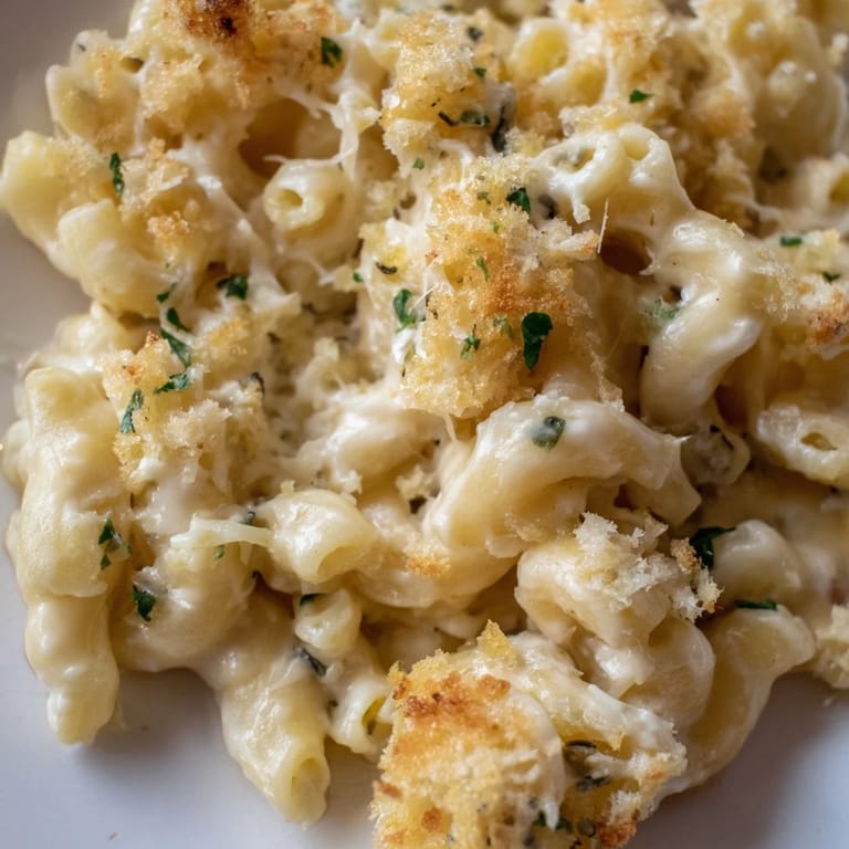 - In a small bowl, mix panko breadcrumbs with melted butter and 2 tbsp Parmesan. Sprinkle evenly over macaroni.
