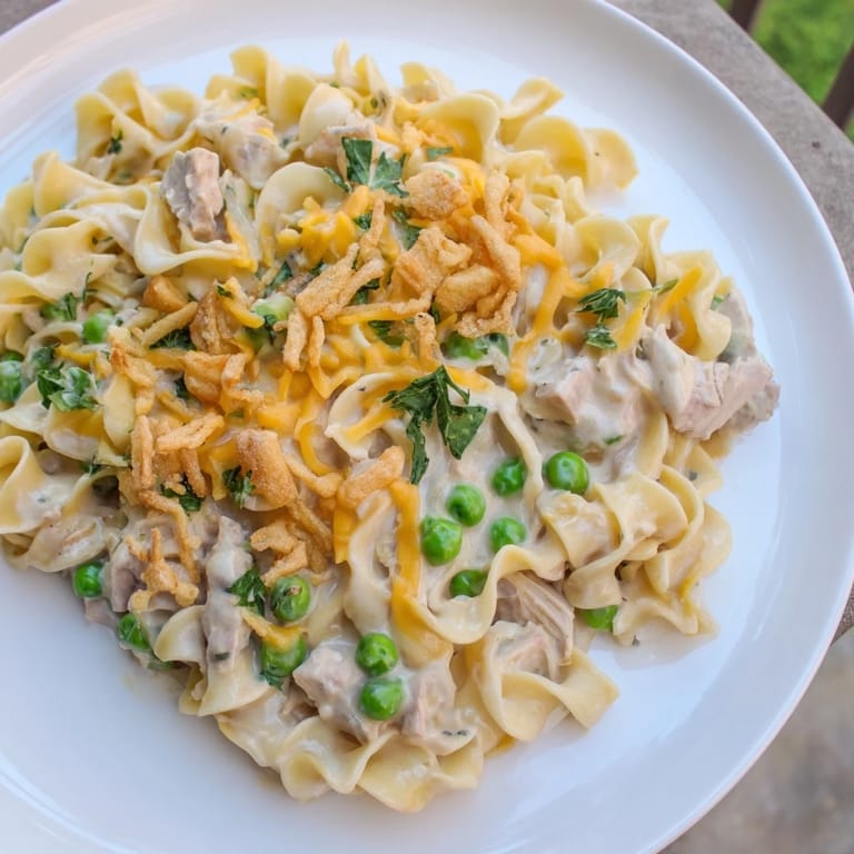 Save A comforting, creamy baked casserole featuring tender noodles, savory tuna, and a golden, crispy onion topping—perfect for family dinners or potlucks.