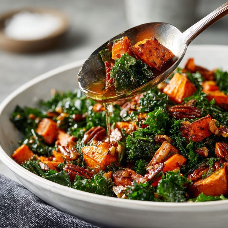 Save This colorful warm salad brings together earthy sweet potatoes and vibrant kale for a cozy side or meatless meal that always disappears fast at my table. Roasting the potatoes makes them silky inside with caramelized edges. Sautéed kale shines with a drizzle of tangy apple cider vinegar and the nutty crunch of toasted pecans. It is perfect when you want something hearty but still loaded with greens.